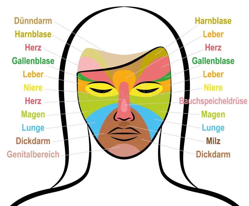 Sie haben wahrscheinlich schon gehört, dass es laut traditioneller chinesischer Medizin (TCM) Bereiche im Gesicht gibt, die mit einzelnen Organen im Körper in Verbindung stehen (siehe Abbildung). Die Nierengegend befindet sich beispielsweise unter den Augen. Das bedeutet in der Praxis, dass eine Schwächung der Nieren, etwa durch anhaltende negative Emotionen, sich in einer Schwellung unter den Augen äußert.