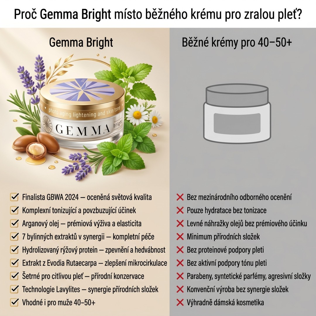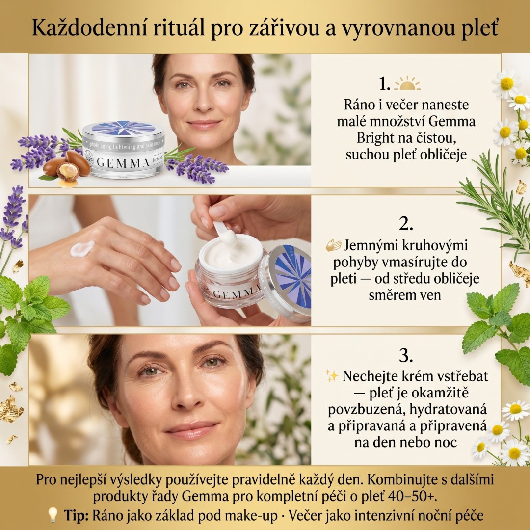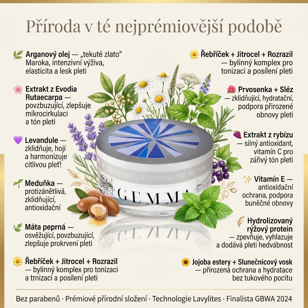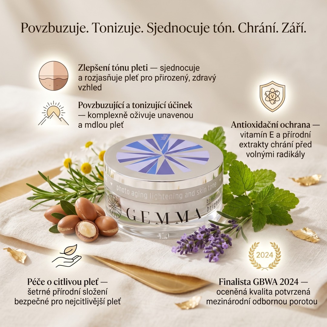 Gemma Bright is a cosmetic product with powerful regenerating and moisturising properties. A skin cream to revive, restore, brighten and revitalize sensitive skin. It has toning effects, which means that it contains substances capable of either preventing or treating the occurrence of problems or alleviating their course. The key is also its beneficial effect on the whole organism, whose activity it also tones, i.e. balances or harmonises. Compared to conventional preparations, it is much gentler, better absorbed, acts on the cause of the trouble, has a deeper and more lasting effect. It is a technologically advanced product with an extremely complex effect.