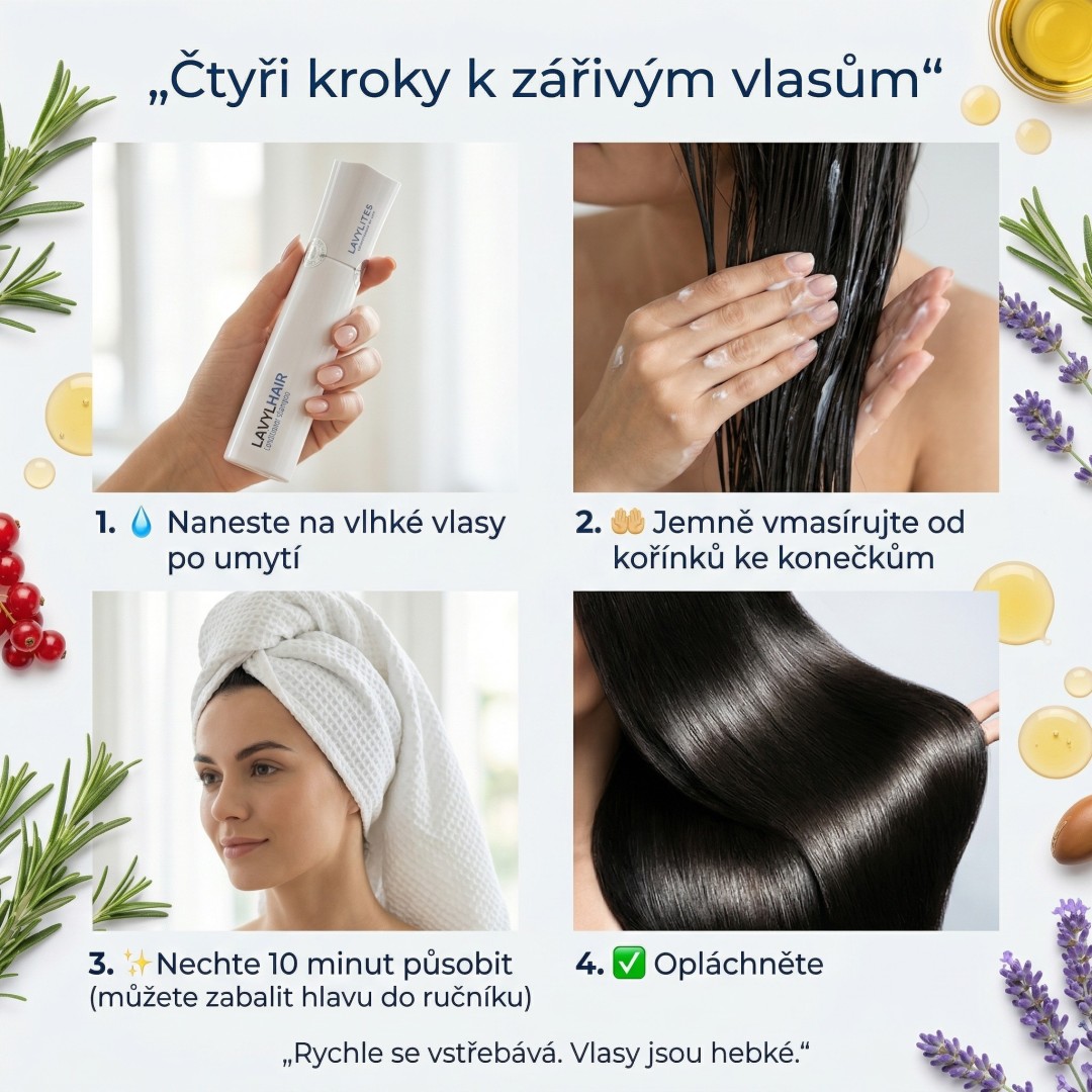 • Slyšela jsem zkušenosti kadeřnice, že Lavyl Hair je ideální jako druhý šampon PLUS maska na vlasy. Potvrzuju, že takto jsem s ním přesně moc spokojená. To znamená, že umývám vlasy svým tuhým šamponem nebo žitnou moukou a jako druhé důkladné mytí použiju Lavyl Hair. Popřípadě by se dal kombinovat se Solvyl Hair. Nechávám na vlasech působit 5-10 minut, zatímco se koupu, čistím si zuby apod. Už po třetím mytí vnímám skvělý pocit ze svých vlasů, jsou vyživené, zarovnaný povrch, ač mám jemné vlasy, objem vydrží rozhodně déle. Stačí mi mýt 2x týdně. Není to srovnatelné s žádnou jinou kosmetikou, přijde mi, že Lavyl léčí celého člověka, kvantová technologie je opravdu znát.